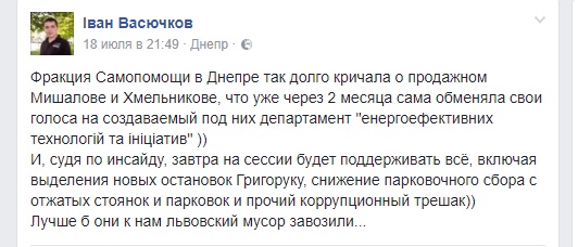 А сами пожелания ярко всплыли уже перед сессией 19 июля. За день ранее общественный активист Иван Васючков сообщил что фракция «Самопомощи» «обменяла свои голоса на создаваемый под них департамент «енергоефективних технологій та ініціатив».
