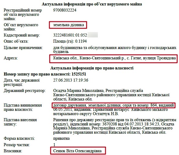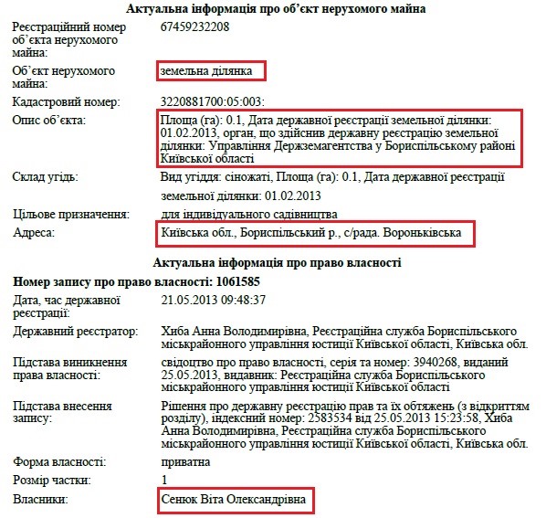 Вита Сенюк также владеет участком площадью 0,1 га возле Киева, на территории Вороньковского сельсовета.