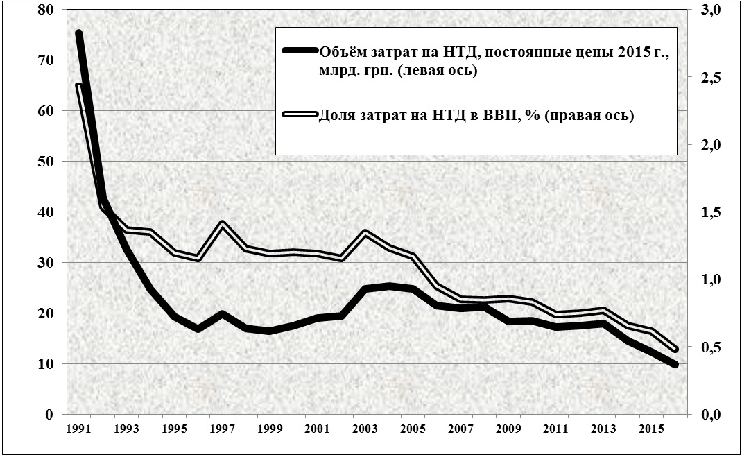 На рис. 2 представлена динамика обоих показателей в Украине в 1991–2016 годы. Поскольку на большей части временного интервала оценивались расходы, предназначенные для финансирования всего комплекса работ, включая научно-технические услуги, в обозначениях присутствует аббревиатура НТД как научно-техническая деятельность. Для удобства восприятия все абсолютные значения мы пересчитали в постоянные цены 2015 года на основе индекса Пааше (дефлятора ВВП).