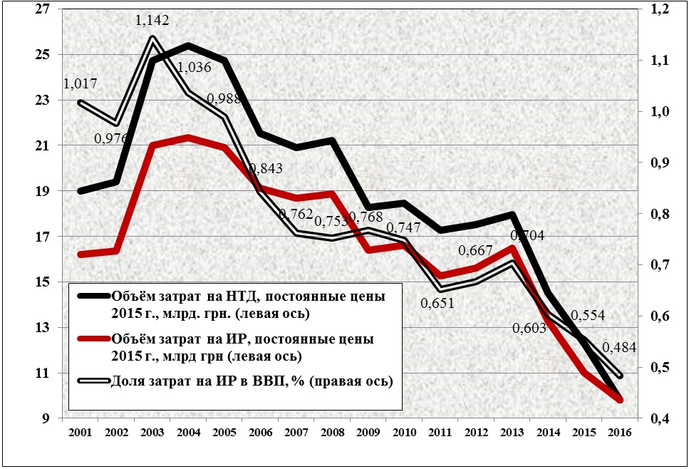 Впоследствии в обществе возобладало утилитарное отношение к науке, и поддержка фундаментальных исследований всего за три года упала в 2,3 раза до 1,89 млрд грн —наихудшего значения в XXI веке. Поддержка прикладных исследований в стране никогда не была приоритетной: в лучшем случае их объём достигал 4,0 млрд грн (2008 год), что сравнимо с соответствующими величинами по научно-техническим услугам в 2003–2005 годах. Именно поэтому масштаб их последующего сокращения в 2009–2016 годах составил «скромные» 1,8 раза, в том числе за последние три года в 1,5 раза.