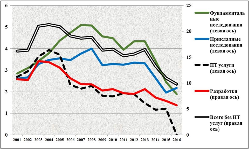 Рисунок наглядно демонстрирует, что локальный экстремум 2004 года достигался за счёт интенсивного раздувания объёма научно-технических услуг до 4 млрд грн в ценах 2015 года (для понимания — это двойной бюджет всех исследований и разработок НАН Украины в 2016 году). Вплоть до 2005 года финансирование услуг превышало объёмы как фундаментальных, так и прикладных исследований. Получалось, что вспомогательный вид деятельности (с точки зрения производства научного знания) становится значимее ведущих.