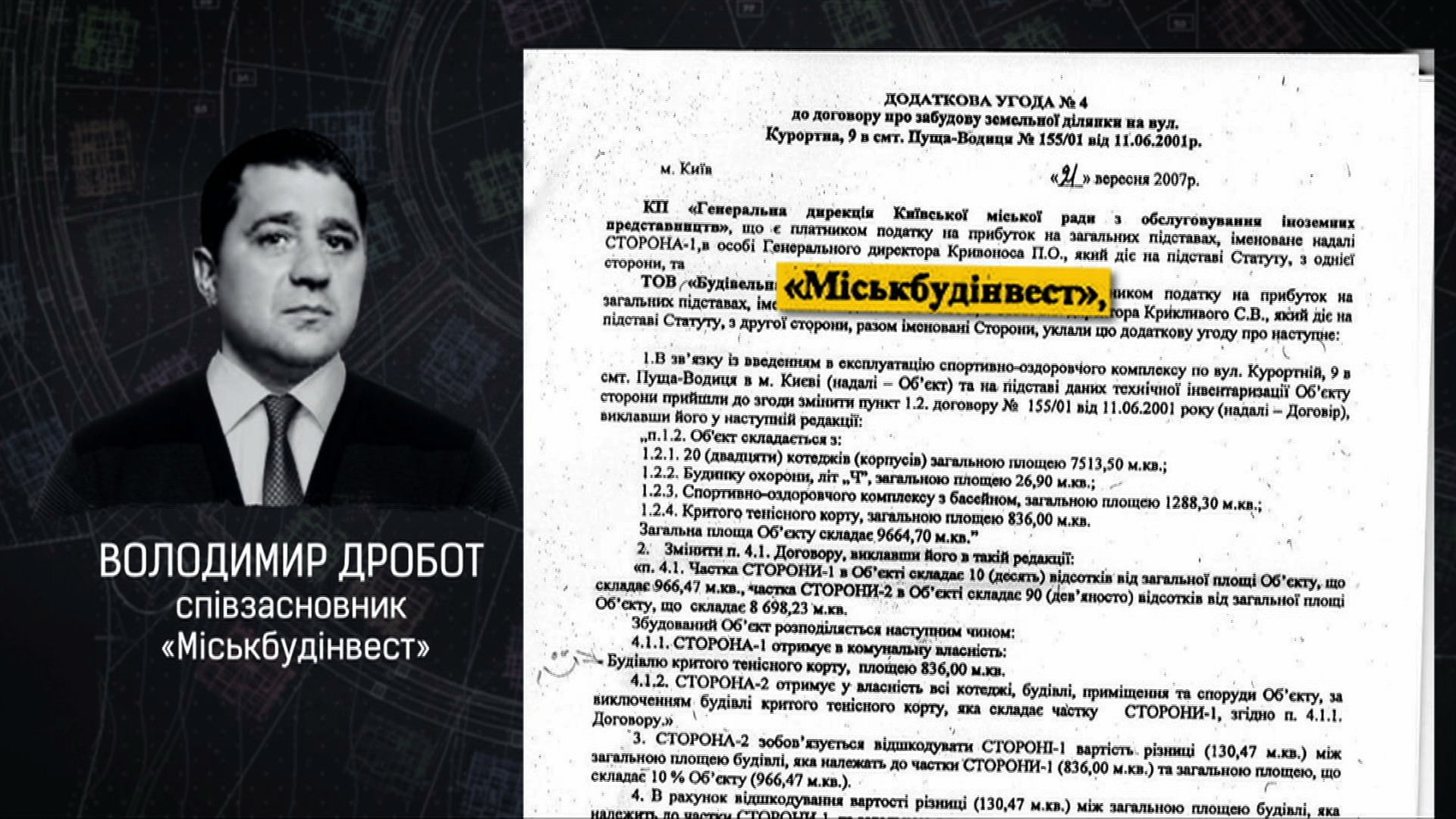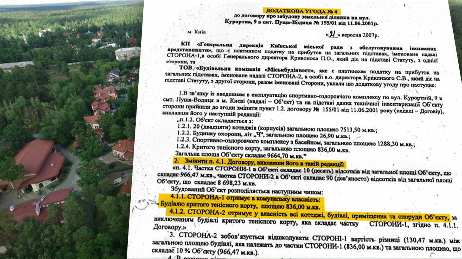 За умовами контракту, забудовник мав передати комунальному на той час підприємству «10% загальної площі об’єкту, визначеної у квадратних метрах житлових будинків». Однак додаткова угода внесла суттєві зміни. За нею дирекції перейшла лише «будівля критого тенісного корту», а забудовник отримав усі котеджі.