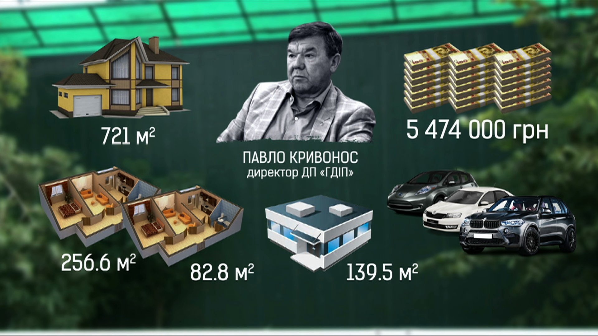 Окрім будинку в Козині, Павло Кривонос задекларував дві квартири в самісінькому центрі столиці, офісні приміщення в елітному печерському районі Києва. Поза цим, іще три автівки та заощаджень на 5 мільйонів гривень.