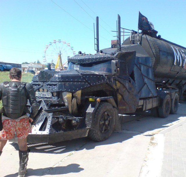 Окрашено авто в черный цвет. У машины есть прицепная цистерна и даже собственное имея "Mad Max".