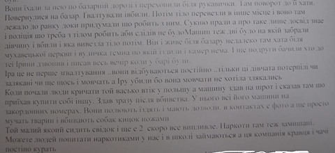 "Вони їхали за нею по базарній дорозі і перехопили біля рукавички. Там поворот до її хати. Повернулися на базар. Ґвалтували і вбили. Потім тіло перевезли в інше місце і воно там лежало до ранку доки придумали, що робить з ним. Сукню прали... Машин теж дві було - на якій забрали дівчину і вбили, і яка вивезла тіло потім", - пишуть у листі.