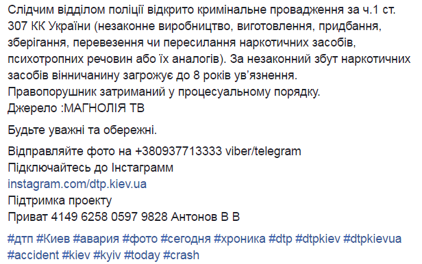 Следственным отделом полиции открыто уголовное производство по ч.1 ст. 307 УК Украины (незаконное производство, изготовление, приобретение, хранение, перевозка или пересылка наркотических средств, психотропных веществ или их аналогов). За незаконный сбыт наркотических средств винничанину грозит до 8 лет тюрьмы.