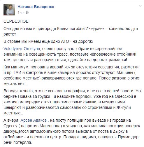 На проблему с ДТП обратила внимание телеведущая Наталья Влащенко. У себя в Facebook она прокомментировала произошедшие аварии: "Сегодня ночью в пригороде Киева погибли 7 человек...