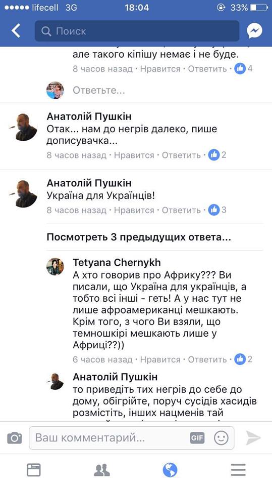 «Депутат Киверцовского районного совета на Волыни Анатолий Пушкин разжигает межрасовую вражду. В комментариях под публикацией о том, что в Луцке избили чернокожих студентов, он обозвал их тараканами и отстаивает мнение, что им не место в Украине», — написала она.