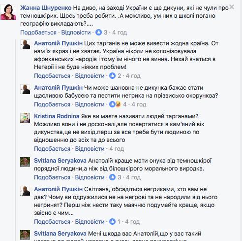 В частности, он называет их «тараканами» и рекомендует «учиться в Нигерии», а женщин, которые встали на их защиту, пугает «нигерийскими кварталами». Об этом на своей странице в Facebookсообщила журналистка Оксана Петрук.