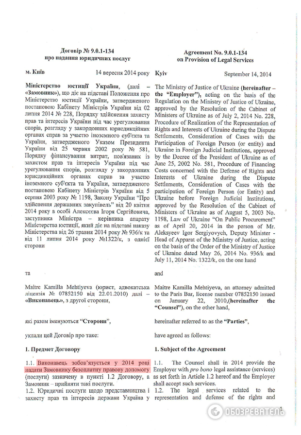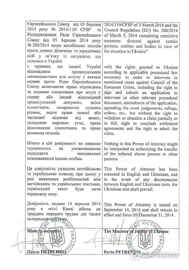 14 сентября 2014 года Министерство юстиции выписало доверенность адвокату Майтpе Камилле Мехтиевой (Maitre Kamilla Mehtiyeva). Согласно документу адвокат будет представлять интересы государства Украина в особе Министерства юстиции в европейских судах. Поисковики никакой информации об адвокате Майтpе Камилле Мехтиевой не выдают.