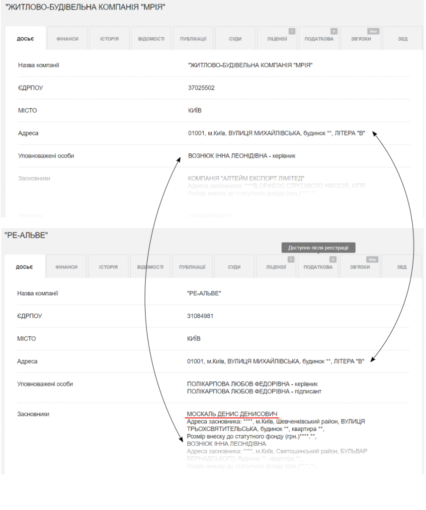 По этому же киевскому адресу зарегистрировано ООО «Ре-алве», один из соучредителей которого всё та же Инна Вознюк. А второй совладелец – Денис Москаль, с которым г-жу Вознюк связывает ещё несколько общих бизнесов.
