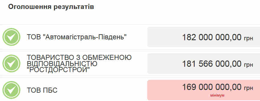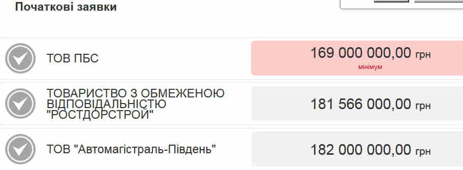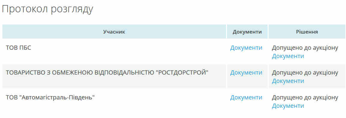 Серед допущених до аукціону учасників цього підприємства ми не побачили. Натомість у торгах взяли участь товариства з обмеженою відповідальністю «ПБС», «Ростдорстрой» та «Автомагістраль-Південь»
