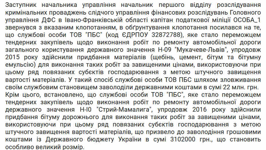 Першого жовтня 2015 року щодо працівників ТОВ «ПБС» зареєстрували кримінальне провадження. У матеріалах справи йдеться про те, що ставши переможцем тендеру на виконання робіт з ремонту автомобільної дороги загального користування державного значення Н-09 «Мукачеве-Львів», «упродовж 2015 року службові особи ТОВ здійснили придбання матеріалів (щебінь, цемент, бітум та бітумну емульсію) для виконання таких робіт за завищеними цінами, використовуючи при цьому ряд пов’язаних суб’єктів господарювання з метою штучного завищення вартості матеріалів. У такий спосіб службові особи ТОВ «ПБС», шляхом зловживання своїм службовим становищем, заволоділи державними коштами в сумі 22 млн. грн».