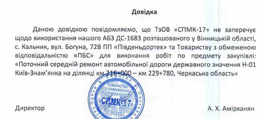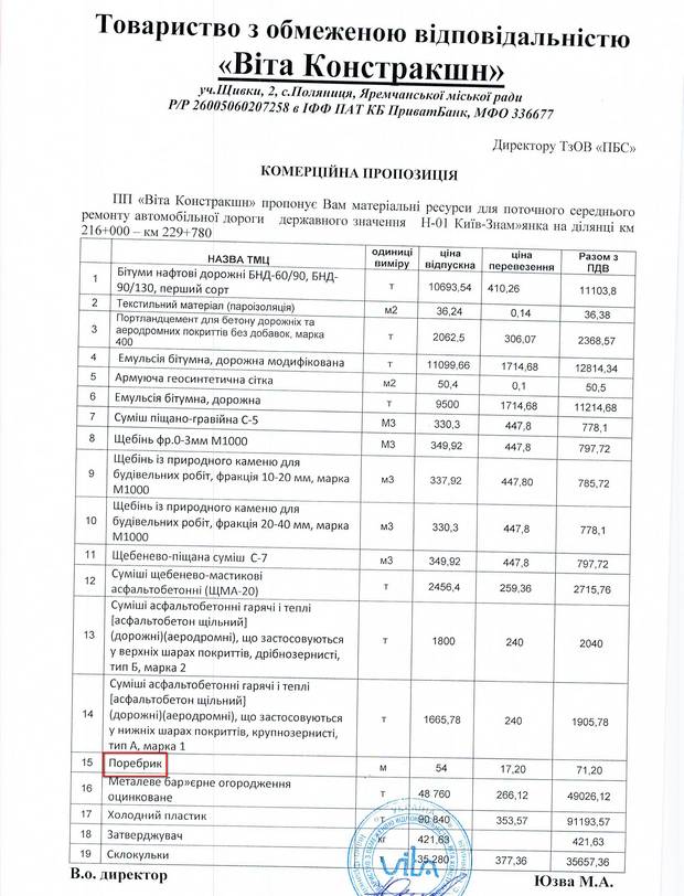 Також підприємство оприлюднило довідку від ТОВ «Віта констракшн» з м.Яремче, Івано-Франківської області, яке надасть ТОВ «ПБС» щебінь, інші суміші для ремонту дороги, оцинковану огорожу та навіть «поребрик». Бенефіціарами ТОВ «Віта констракшн» є італійці.