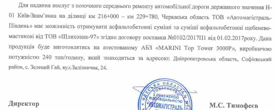 Також ТОВ зазначило, що возитиме асфальтобетон та щебеневі суміші виробництва одеського ТОВ «Шляховик-97»за більш як 200 км із сусідньої Дніпропетровської області, де розташовані потужності цього підприємства.