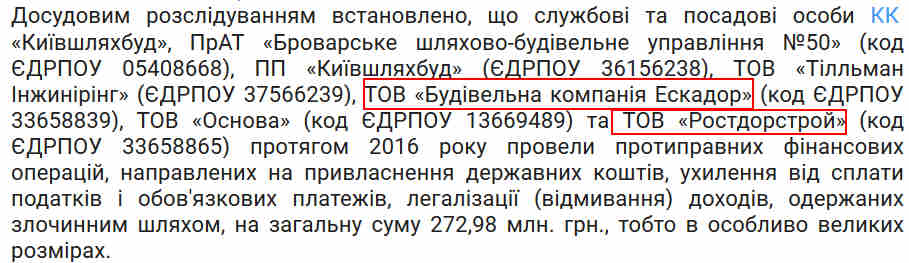 Щодо ТОВ «БК «Ескадор», ТОВ «Ростдорстрой» та ще п’яти підприємств 03.03.2017 року було зареєстроване кримінальне провадження за фактом неправомірних дій службових осіб Комунальної корпорації «Київавтодор» та службових осіб, переможців тендерних закупівель, за ознаками вчинення кримінальних правопорушень, передбачених ч. 5 ст. 191, ч. 3 ст. 209, ч. 3 ст. 212 КК України.