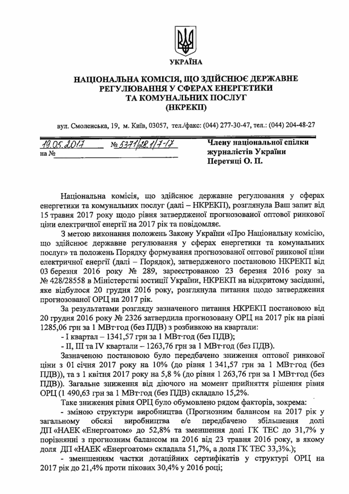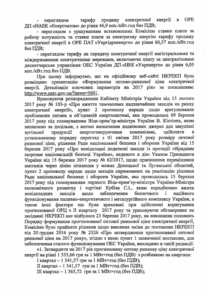 После установления прогнозной ОРЦ в первом квартале 2017 года на уровне 1 341,57 грн за МВт-ч комиссия изначально планировала снижение ОРЦ на электроэнергию на 6% до 1 263,76 грн за МВт-ч, но постановлением № 337 она повысила ОРЦ еще на 1,8% — до 1 365,72 грн за МВт-час.