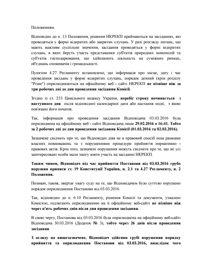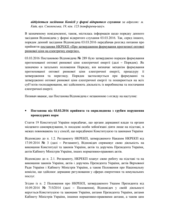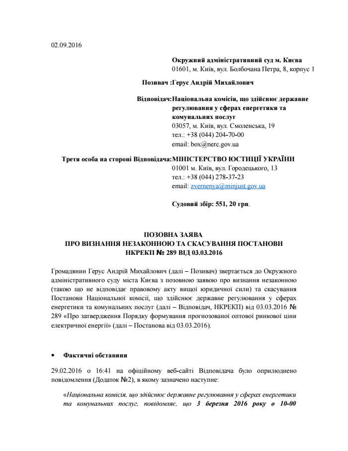 В сентябре 2016 года Герус попросил суд признать постановление НКРЭКП № 289 от 3 марта 2016 года незаконным и отменить его. Эксперт считает, что регулятор принял и обнародовал постановление с грубым нарушением процедурных норм, что привело к недопустимому росту цен на электричество.