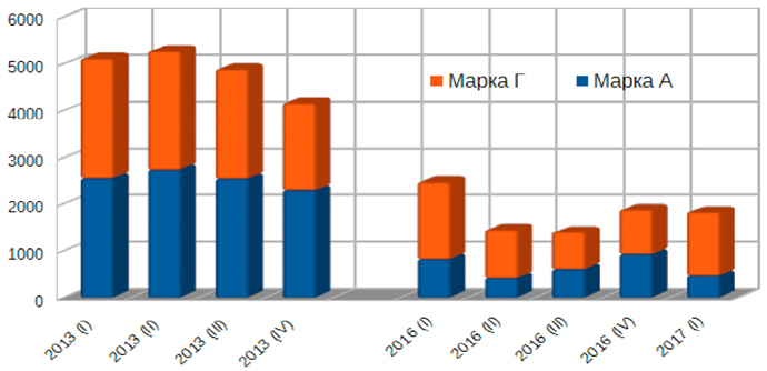 Рассматривая ежеквартальную динамику запасов угля на складах ТЭС в довоенный 2013 год и в «роттердамский» 2016 год, можно наблюдать среднегодовое падение запасов угля в 2,7 раза: марки «А» — в 3,7 раза, марки «Г» — в 2,1 раза.