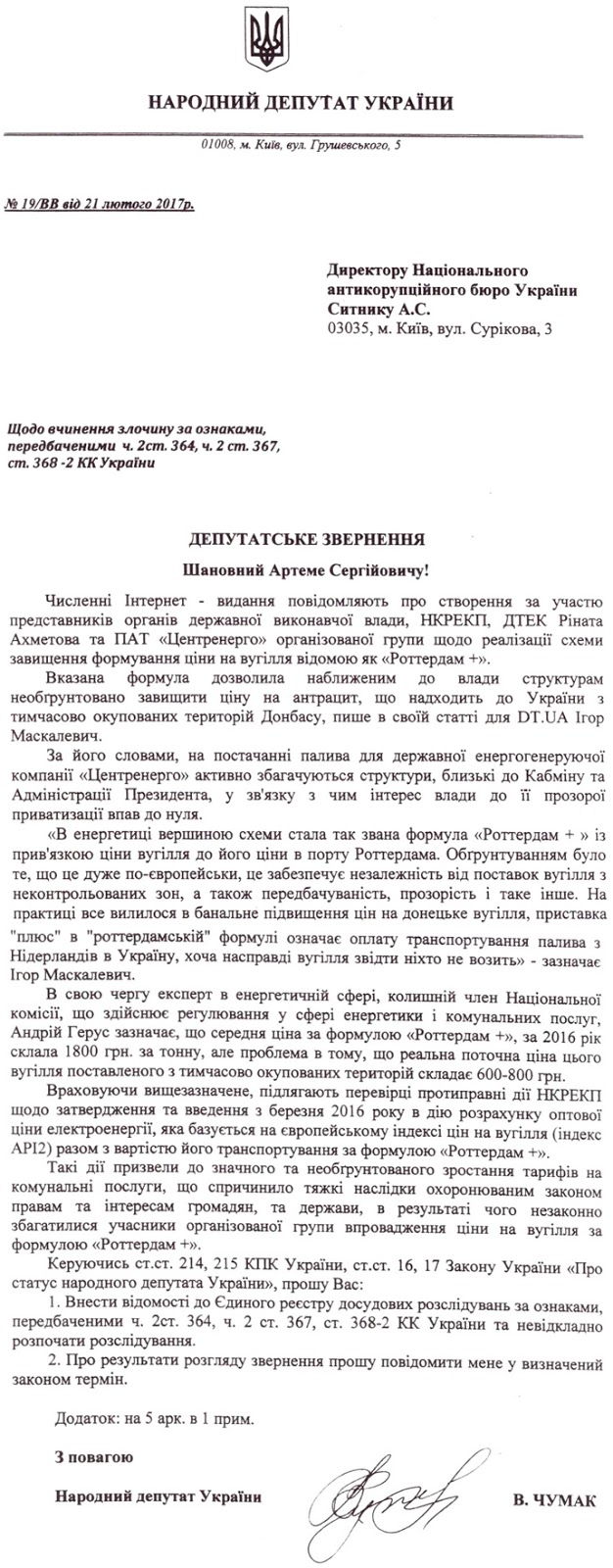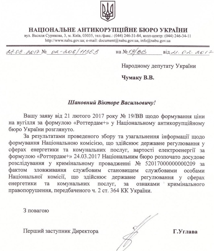 21 февраля 2017 года он направил депутатское обращение в Национальное антикоррупционное бюро. В документе он написал, что действия НКРЭКП привели к значительному необоснованному росту тарифов на коммунальные услуги, в результате чего незаконно обогатились участники организованной группы.