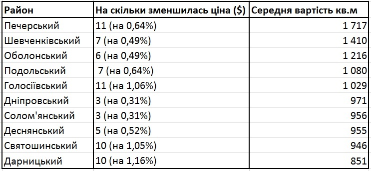 У липні ціни на одно-, дво- та трикімнатні квартири в недобудованих будинках в Києві продовжували знижуватися. Найдешевшим традиційно залишається Деснянський район - тут ціна за 1 кв. м у середньому становить $793. Найдорожчий - Печерський район, де середня ціна продажу квартир склала $1430 за «квадрат».