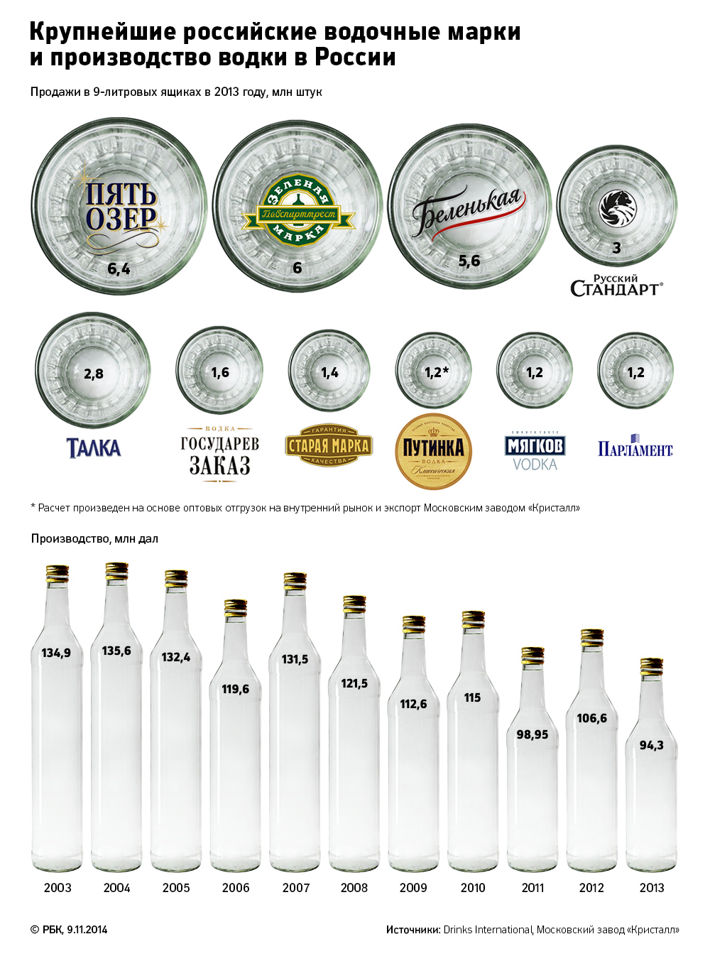 Смена дистрибьютора не сумела остановить падения популярности «Путинки». В 2011 году ее производство рухнуло на 52,9% до 1,35 млн дал, следует из отчета завода «Кристалл».