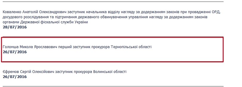 Но и это еще не все представители семьи Голомши в прокуратуре. Сын экс-главы МВД в Киевской области и, соответственно, племянник экс-заместителя Генпрокурора Николай Ярославович Голомша-младший 26 июля 2016 года тоже получил прокурорскую должность - приказомГенпрокурора Украины он назначен первым заместителем прокурора Тернопольской области.