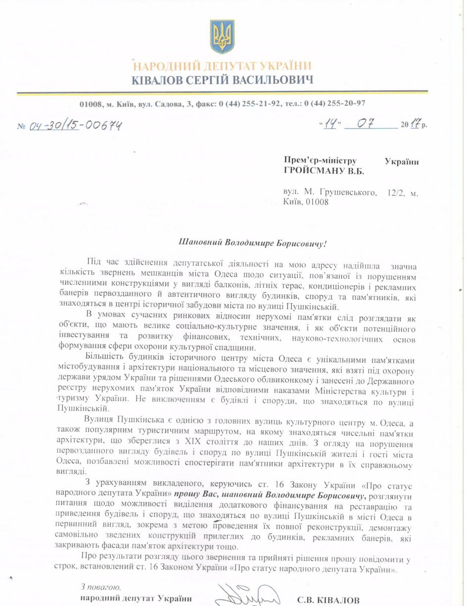 Мною были направлены соответствующие обращения к руководителям города и области о необходимости приведения исторических фасадов ул. Пушкинской в надлежащий вид. Однако, понимая то, что собственными силами городские власти вряд ли реализуют эту масштабную программу, я также обратился к премьер-министру о выделении из государственного бюджета дополнительных средств для сохранения исторического облика одной из центральных улиц города Одессы.