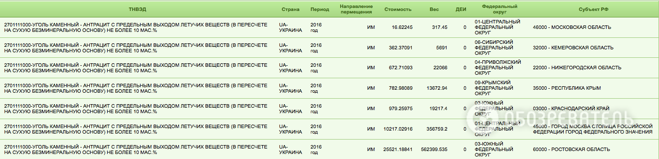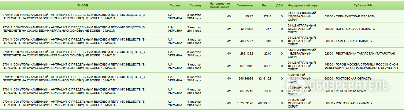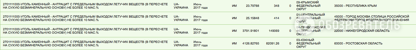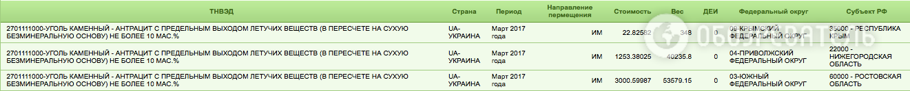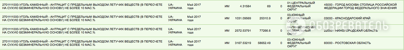 Однако "Обозреватель" нашел подробную информацию о том, когда, куда, почем и сколько украинского антрацитового угля было импортировано в Россию не только в предыдущие годы — в 2014, в 2015, в 2016, но и уже после блокады в 2017. Почему это важно? Это прямое свидетельство того, что наш антрацит боевики переправляют в РФ.
