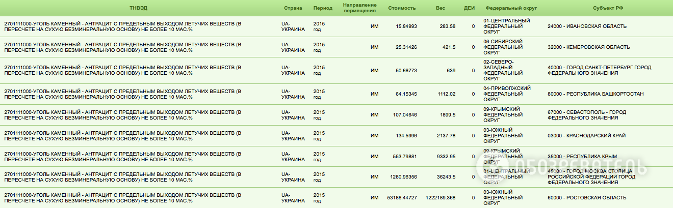 Так, согласно данным официальной статистики Федеральной таможенной службы России, в первом полугодии 2017 года из Украины было поставлено в Россию 703 тыс. тонн антрацита общей стоимостью $29,23 миллионов. Поставки осуществлялись в направлениях от временно оккупированного Крыма до Сибири: