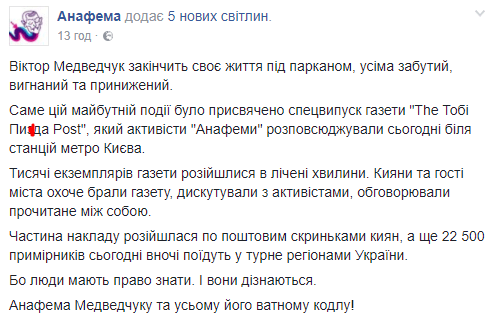 "Киевляне и гости города охотно брали газету, дискутировали с активистами, обсуждали прочитанное между собой… Потому что люди имеют право знать. И они узнают. Анафема Медведчуку и всем его в*тному кодлу!" - говорится в тексте.