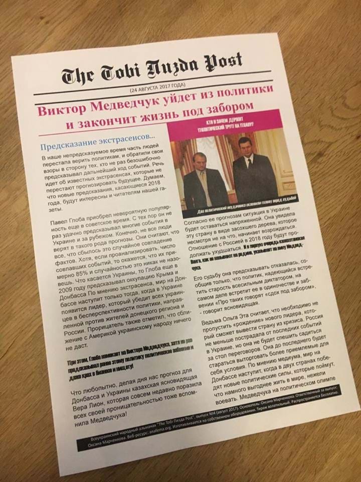 В Киеве активисты распространили несколько тысяч экземпляров газеты "The Тобі П**да Post", в которой говорится, что кум президента России, лидер движения "Украинский выбор" Виктор Медведчук закончит свою жизнь в изгнании, всеми забытый и униженный.