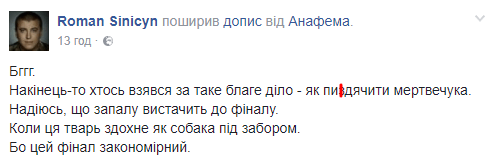 В свою очередь волонтер Роман Синицын в соцсети написал: "Наконец-то кто-то взялся за такое благое дело… Надеюсь, что запала хватит до финала. Когда эта тварь сдохнет как собака под забором. Ибо финал закономерен", - говорится в тексте.