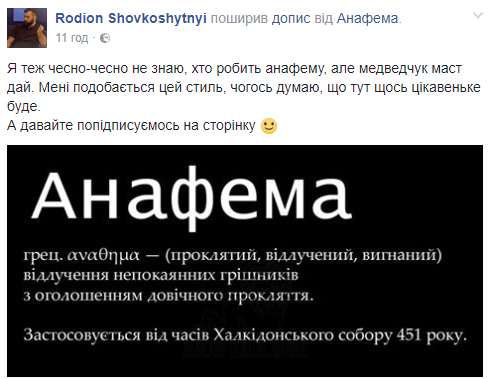 "Я тоже честно-честно не знаю, кто делает анафему, но медведчук mustdie. Мне нравится этот стиль, чего думаю, что здесь что-то интересное будет", - отметил он.