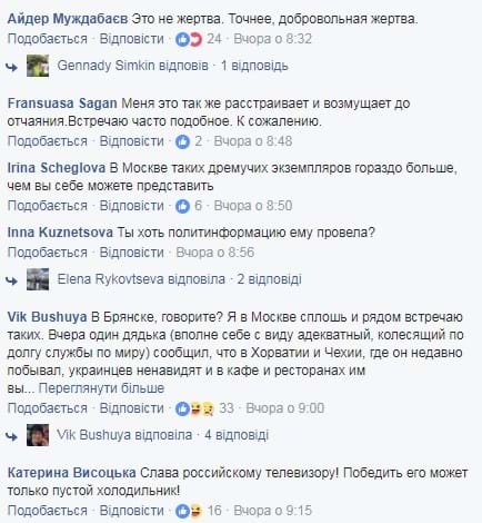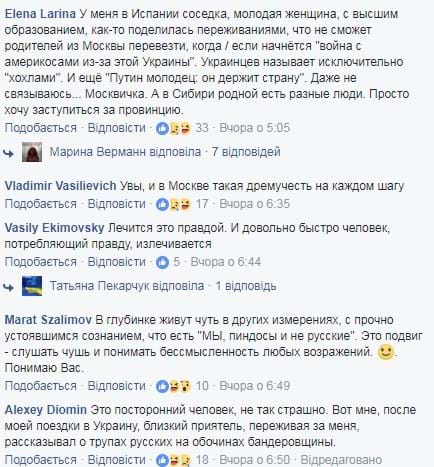 "У меня в Белгороде (на границе с Украиной, уж ближе некуда) есть знакомый "тяжелый случай". Непробиваемый тип, все винит американцев во всех бедах и страшно бесится, когда ему пытаешься растолковать что-то. Клинический случай, с высшим образованием, с виду приличный человек", - отметила Евгения Долиненко.