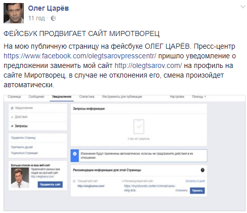 Теги: ФейсбукОлег ЦаревСайт Миротворец