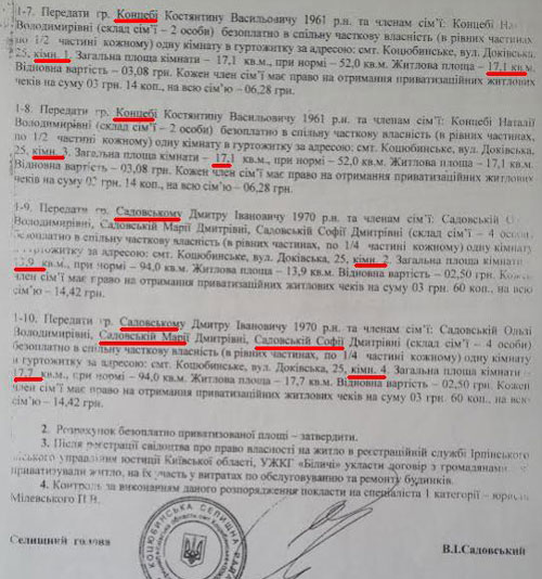 Так, згідно з текстом документу, кімнати у приватну власність отримують Дмитро Іванович Садовський (повний тезка брата селищного голови) та Ольга Володимирівна Садовська, яка за збігом обставин є повною тезкою дружини брата селищного голови Вадима Садовського. А також їхні діти, пише kiev.pravda.com.ua