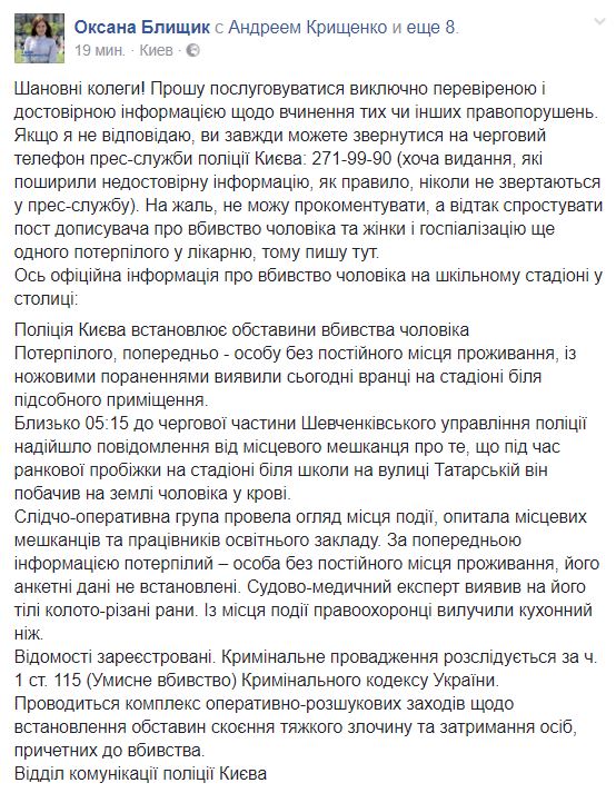 Полиция Киева устанавливает обстоятельства убийства мужчины. Предварительно - это лицо без определенного места жительства, его с ножевыми ранениями обнаружили сегодня утром на стадионе возле подсобного помещения. Около 5:15 в дежурную часть Шевченковского управления полиции поступило сообщение от местного жителя о том, что во время утренней пробежки на стадионе возле школы на улице Татарской он увидел на земле мужчину в крови. Следственно-оперативная группа провела осмотр места происшествия, опросила местных жителей и работников образовательного учреждения. Судебно-медицинский эксперт обнаружил на его теле колото-резаные раны. С места происшествия правоохранители изъяли кухонный нож. Уголовное производство расследуется по ч. 1 ст. 115 (Умышленное убийство) Уголовного кодекса Украины. Проводится комплекс оперативно-розыскных мероприятий по установлению обстоятельств совершения тяжкого преступления и задержанию лиц, причастных к убийству", - написала Блищик.