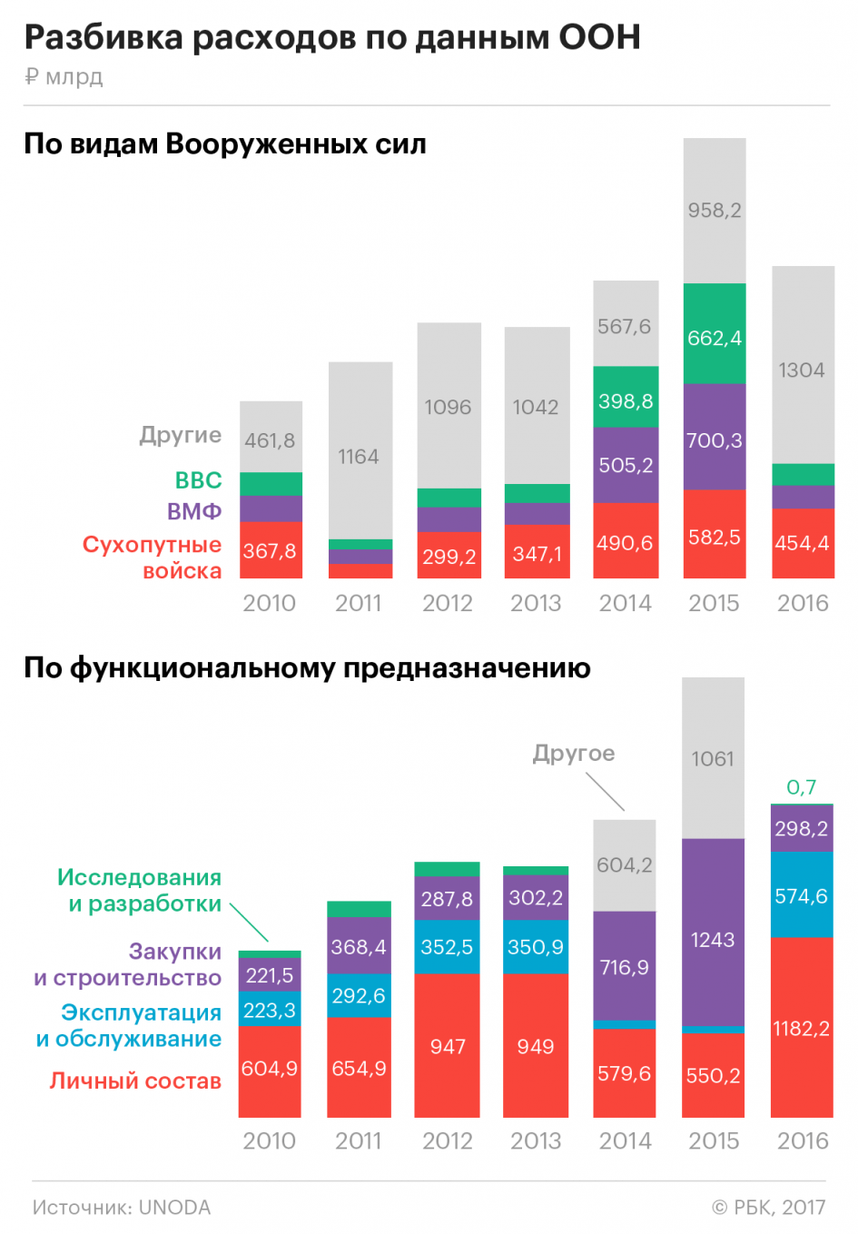 Так, как пишет РБК, согласно данным, переданным в ООН, военные расходы РФ в 2016 году сократились на 29% по сравнению с 2015 годом и составили 2,1 триллиона рублей.