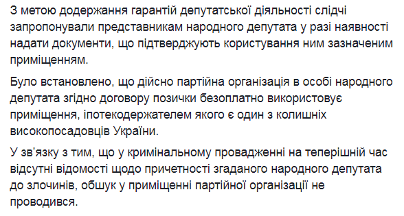 "Было установлено, что действительно партийная организация в лице народного депутата по договору ссуды безвозмездно использует помещения, ипотекодержателем которого является один из бывших высокопоставленных Украины", - говорится в сообщении.