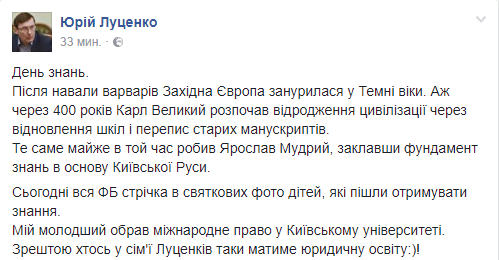 Пост, посвященный Дню знаний, Луценко начал издалека.