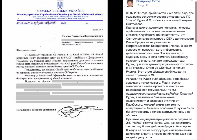 В нашому випадку, під покровительством жителя села Петропавлівська Борщагівка, голови СБУ Василя Грицака який, за публікаціями у соціальних мережах, отримав безпосередньо від сільського голови Кодебського Олексія при досить “загадкових” обставинах чимало землі в цьому ж селі, в обхід чинного законодавства було домовлено про посаду голови Обухівської РДА для жителя села Петропавлівська Борщагівка (ЖК “Петропавлівський”) Івана Рудяка.