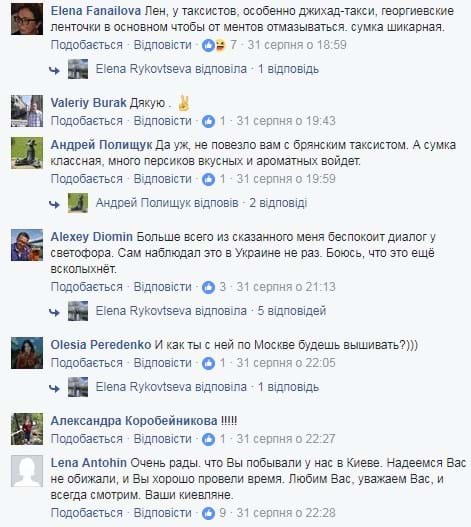 Она рассказала, что купила сине-желтую сумку на память о поездке в Украину. И когда после поезда вызвала такси, ожидала услышать поучения в лучших традициях кремлевской пропаганды. Тем более, что в салоне автомобиля была георгиевская лента.