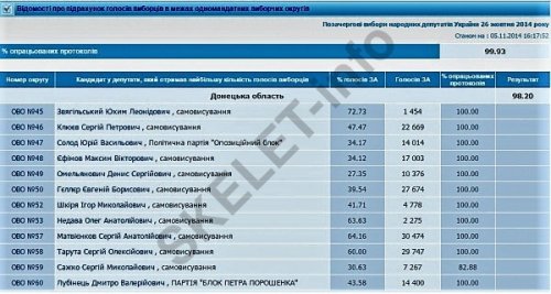 Что ж, 45-й округ был выбран Звягильским не случайно: он охватывает Киевский район Донецка, Ясиноватский район и Авдеевку, то есть большая часть округа находится под контролем сепаратистов, а остальная – это фронтовая зона. Можно было заранее предсказать, что в выборах примут участие только немногие жители Авдеевки, да и то в коротком перерыве между обстрелами. Так и случилось: в день выборов на всем округе открылись лишь несколько участков, на которых полностью отсутствовал контроль со стороны общественности и политических партий (желающих поработать там наблюдателями не нашлось). Результаты голосования были подсчитаны и отправлены в Киев мгновенно, а ЦВК утвердила их первыми – так и не увидев на 45-м округе никаких нарушений.