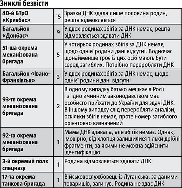 По состоянию на сегодня нет совпадений по ДНК по 37 военнослужащим и добровольцам (принадлежащих к первым трем описанных категорий). В то же время 19 погибших украинских воинов, чьи тела вывезены из района Иловайска, также вообще не идентифицированы (кроме того, есть еще два тела, о которых нельзя с уверенностью сказать, что они принадлежат украинской стороне). Очевидно, эти 19 — погибшие, чьи семьи не сдали ДНК или в отношении которых по разным причинам нет совпадений по ДНК.