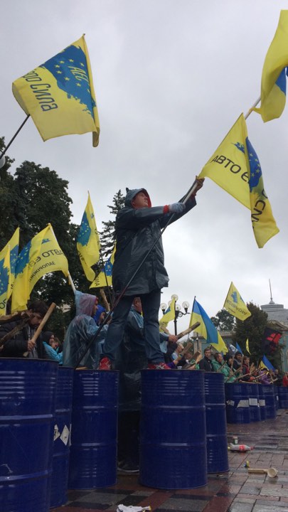 Акция хорошо организована. Ее участники размахивают флагами с символикой»Авто Евро Сила» и стучат по бочкам.
