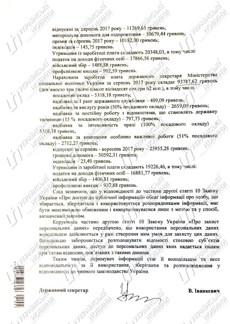 Зарплата первого заместителя министра Ольги Крентовской составила 38 315,28 гривень, заместителей Натальи Федорович, Николая Шамбира и Александра Привалова от 47 240,4 гривень до 99 258,66 гривень (кому сколько в ответе не указано) и госсекретаря Виктора Иванкевича - 93 787,62 гривень.