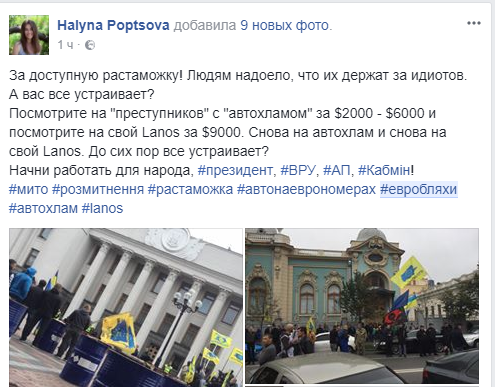 Пользователь Галина Попцова согласна с этой точкой зрения. "За доступную растаможку! Людям надоело, что их держат за идиотов. А вас все устраивает? Посмотрите на "преступников" с "автохламом" за $2000 - $6000 и посмотрите на свой Lanos за $9000. Снова на автохлам и снова на свой Lanos. До сих пор все устраивает? Начни работать для народа, #президент, #ВРУ, #АП, #Кабмін! "