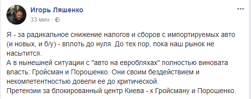 "Я - за радикальное снижение налогов и сборов с импортируемых авто (и новых, и б/у) - вплоть до нуля. До тех пор, пока наш рынок не насытится. А в нынешней ситуации с "авто на евробляхах" полностью виновата власть: Гройсман и Порошенко. Они своим бездействием и некомпетентностью довели ее до критической. Претензии за блокированный центр Киева - к Гройсману и Порошенко".