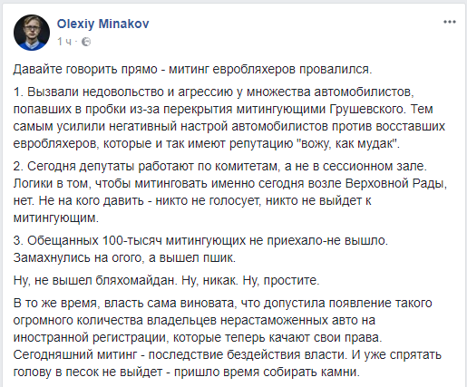 Блогер и политический обозреватель Алексек Минаков также возлагает вину за ситуацию с владельцами еврономеров на власть. Но при этом подчеркивает, что митинг автолюбителей провалился.